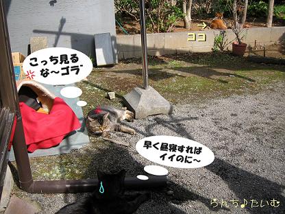 以外に陽が射してて暖かかったので ネコトリオはお庭で日向ぼっこでした
